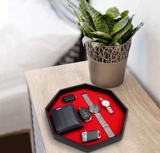 ПІДНОС ДЛЯ КОСТІВ З ЕКОЛОГІЧНОЇ ШКІРИ: наш піддон для кубиків виготовлений з чорної екошкіри та обшитий м’яким червоним оксамитом. Піднос має розміри 29 см x 29 см і висоту 4 см. Лоток має міцні бічні стінки, які утримують кістки всередині. Восьмикутна форма лотка дозволяє кубикам відскакувати від його внутрішніх стінок.