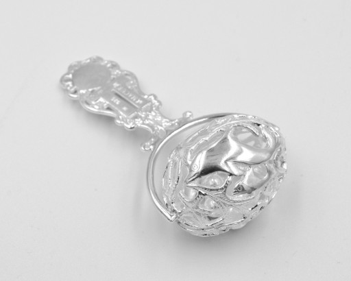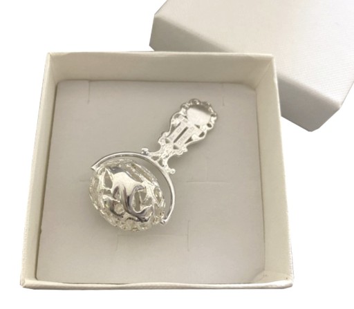 Брязкальце у вигляді срібної кульки, ручка прикрашена витонченим ажурним візерунком.
