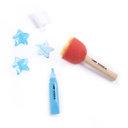 У набір входить 5 великих штампів з дерев'яною ручкою з різними малюнками: зірочка, ведмедик, квітка, будиночок, зайчик і фарби 6 інтенсивних кольорів (фіолетовий, синій, зелений, цей, оранжевий і червоний).