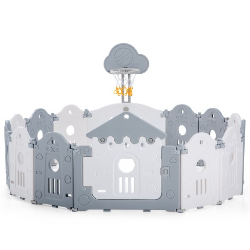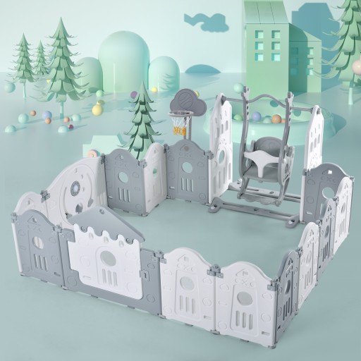 Цей багатофункціональний манеж створений за моделлю замку і дає вашій дитині відчуття, ніби вона потрапила у власний замок. Кожна пластина має опуклу вершину. Зокрема, двері та верхні панелі з обох боків гойдалок більше нагадують дахи. Рамка для лазання, регульована по висоті баскетбольна стійка та гойдалка, що входять до цього манежу, забезпечують багато ігор для дітей. Крім того, манеж 3 в 1 повністю розвиває спортивний потенціал, інтелектуальний і художній талант дитини.