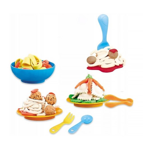 Аксесуари, що входять в комплект, ніж, чайна ложка або тарілка і миска ідеально підходять для подачі готових страв.Прикрасьте пасту декоративними формочками і готово! :)Ігрове тісто підходить для багаторазової гри. Створювати страви з макаронів можна нескінченно!