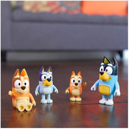 Включно з усіма чотирма членами родини Блуі: Блюі, Бінго, Бандитом (тато) і Чілі (мама). Додайте 4 друзів Блюі та Бінго: Коко, Снікерс, Расті та Маффін. Є багато наборів іграшок та аксесуарів, які збагатять світ Bluey's.