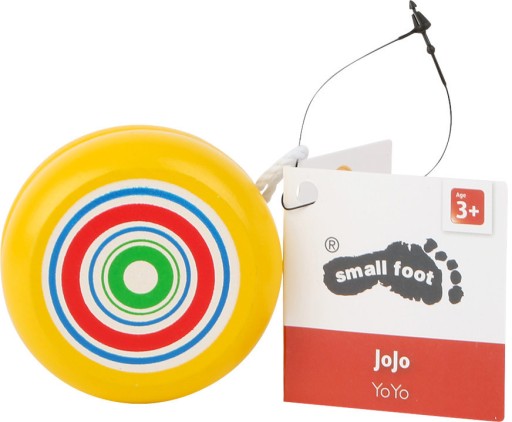 JOJO виготовлений з дерева та гарно пофарбований та покритий безпечними фарбами. Має жовтий колір і кружечки кольорів: зелений, синій, білий і червоний. Також має натуральну білу нитку.