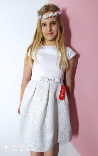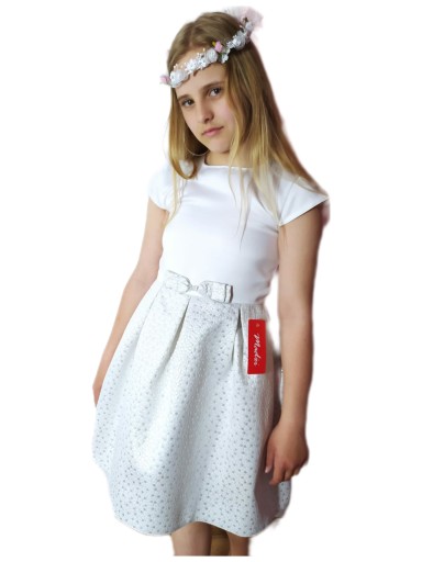 Сукня для причастя, виготовлена на польській фабриці. Високоякісні матеріали, обробка з увагою до деталей, пошита за дуже хорошим стандартом. Модель сукні з красивим срібним декором низу, бантом, пришитим на талії. Сукні, які ми продаємо, є дуже хорошої якості.