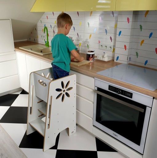 Наш кухонний помічник – це міцний продукт, який повністю виготовлений у Польщі. Ми побудували його з ламінованих МДФ плит, що робить його стійким і безпечним. Все було оброблено вручну, щоб жоден гострий край чи стирчить осколок не становили загрози для малюка.