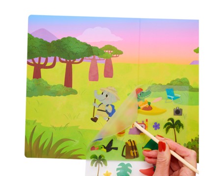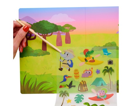 Гей, пригода! Настав час довгої подорожі у світ диких тварин! Розвивайте свою уяву і перенесіться у світ джунглів. У набір входить двостороння дошка з фоном, 60 наклейок і паличка для обведення візерунків. Створіть захоплюючу історію, використовуючи власну вклеєну картинку!