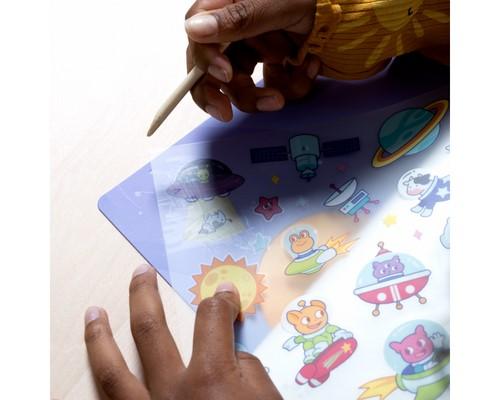 У набір входить двостороння дошка для наклейок і 60 наклейок, за допомогою яких ви створите власну фантастичну історію!