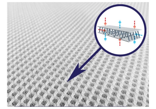 - Численні горизонтальні вентиляційні канали, розташовані на обох спальних поверхнях, об'єднані з вертикальними каналами, що проходять через товщину матраца, і каналами, вирізаними всередині вставки. Така структура забезпечує вільний потік повітря в центр дитячого матраца через тривимірну аераційну сітку, вшиту по всьому колу чохла.