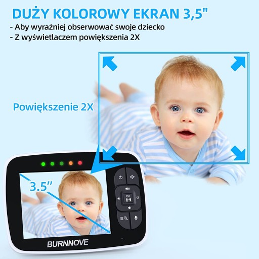 Відеоняня з камерою оснащена 3,5-дюймовим РК-екраном і камерою, яка обертається на 355° по горизонталі та на 120° по вертикалі та забезпечує дуже чітке зображення для спостереження за вашою дитиною. Крім того, він оснащений 2-кратним цифровим зумом, щоб ви могли бачити більше деталей вашої дитини.