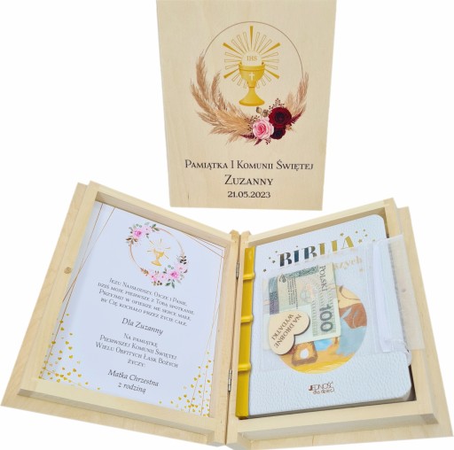 На кришці коробки є ім’я та дата Першого Святого Причастя дитини, а також красивий графічний мотив, надрукований безпосередньо на дереві.