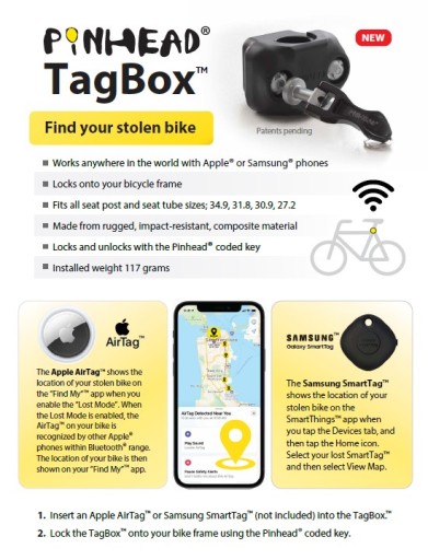TagBox був створений для захисту від крадіжки велосипеда, але він працюватиме всюди, де його можна постійно прикріпити, наприклад, до скутера, коляски, причепа чи човна.