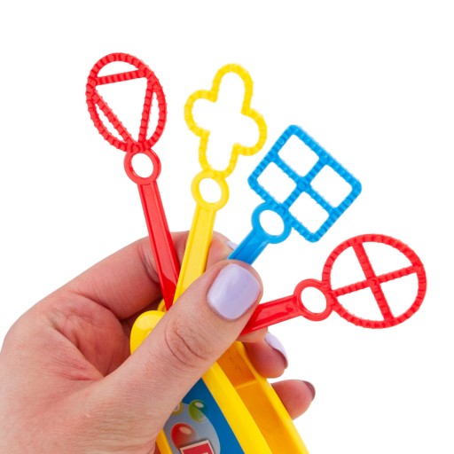 â Він має обідок із наконечниками для бульбашок різної форми, щоб створювати незліченну кількість різнокольорових бульбашок.