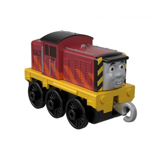 Перед нами один із героїв казки –силуети! Давайте знайомитись! Це маленький червоно-жовтийлокомотив з милим обличчям спереду. Чим вони відрізняються? Він веселий тусовщик!По боках у нього помаранчеві смужки і чорний напис "SALTY". Колеса автомобіля чорного кольору. Силуети переду і спинки тримаєгачок,що дозволяє приєднувати інші локомотиви та вагони цієї серії.