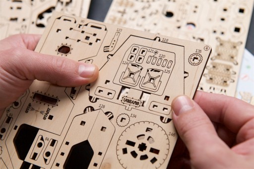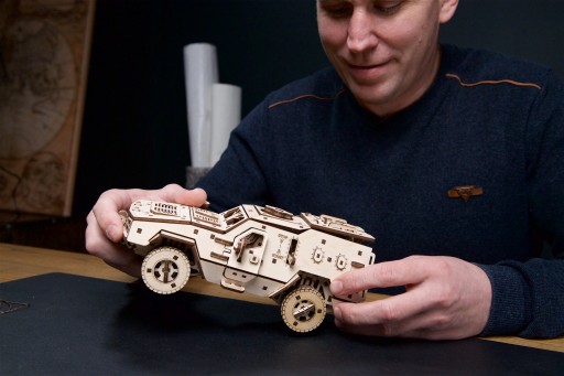 Модель UGEARS бойової машини «Дозор-Б» теж пишається українським виробництвом. Він має «броню» у вигляді фанери товщиною 3,7 мм, повний привід, повну підвіску і пружинний двигун, що дозволяє долати значну відстань (близько 8 метрів). Бойова машина Ugears Dozor-B оснащена робочою лебідкою, як і її реальний аналог, для самостійного підйому або підйому транспортних засобів подібної ваги, тому що це UGEARS і тому, що ми любимо тішити та дивувати наших шанувальників крутими додатками. Витягніть лебідку, встановлену на передньому бампері, зачепіть її за якийсь предмет і спостерігайте, як вона потягне Дозор-Б вперед!
