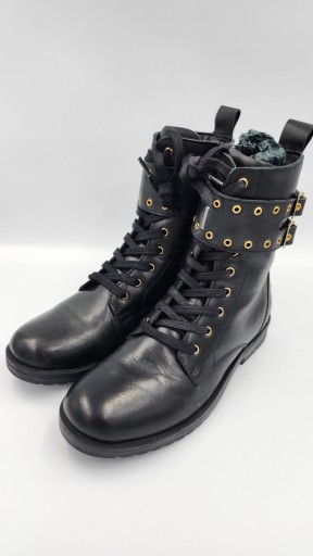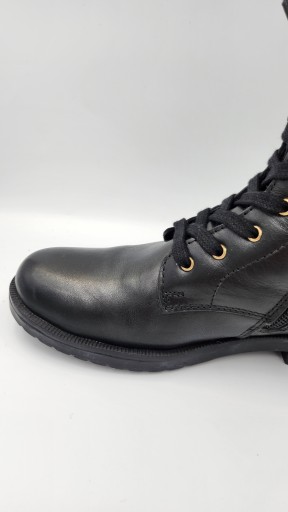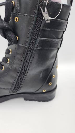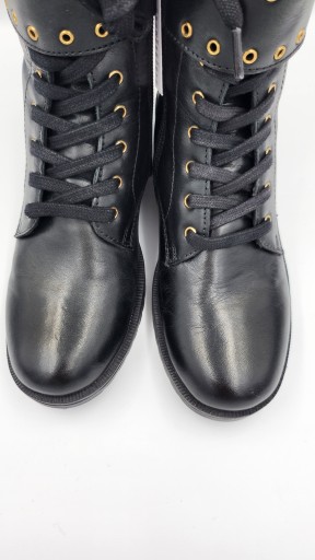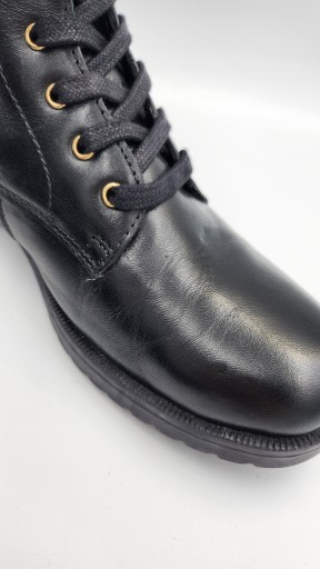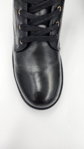 Черевики на шнурівці з натуральної шкіри чорного кольору. прикрашений золотистими пряжками, що надає взуття характеру. Бічна блискавка для легкого одягання та знімання.
