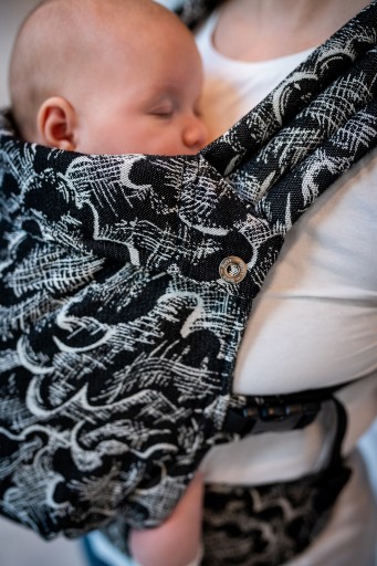 Застібки, що регулюють висоту коміра, є прикрасою люльки і додають їй шарму. Щоб відрегулювати довжину лямок, ми використовували регулювальну стрічку та тонкі магніти, щоб утримувати тканину в потрібному місці, коли ми носимо дитину на спині. З іншого боку, стегновий ремінь і розташована на ньому панель, яка регулює ширину, - це повна інновація, яку ви не знайдете більше ніде. Завдяки використанню смужок на регулювальній стрічці ми, по-перше, можемо дуже точно відрегулювати тримач, а крім того, панель красиво і дуже естетично складається.