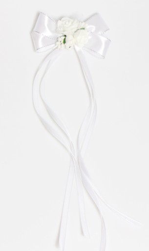 - НАСТІННЕ ДЕКОРАЦІЯ - бантик, прикрашений квітами, на білій декоративній гумці, розміром приблизно 8 см х 5 см + висять стрічки.