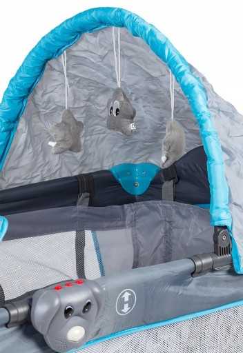 Є заспокійлива мелодія собаки і функція вібрації, яка змушує ліжечко м'яко вібрувати, що заколисує малюка. Різнобарвне світло стимулює зір.