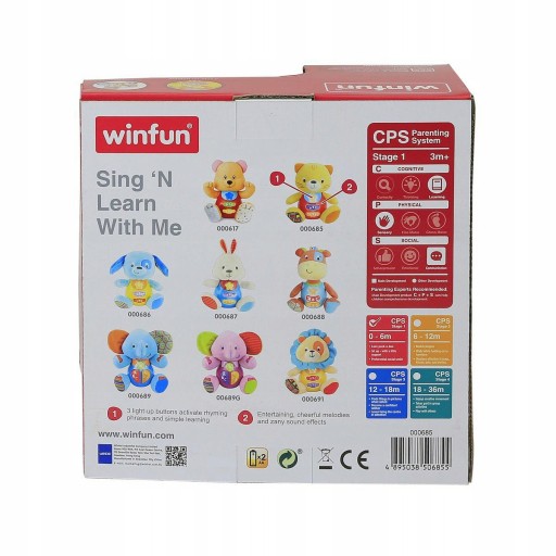 На животі є три кольорові функціональні кнопки, які активують різні мелодії та навчають дітей основним цифрам і буквам.