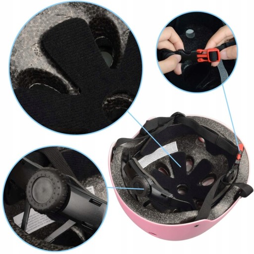 Регульований шолом і регульований ремінь для шолома і наколінники Налокітники Накладки на зап'ястя Еластичні ремені із застібкою-липучкою дозволяють легко надягати і знімати шолом.