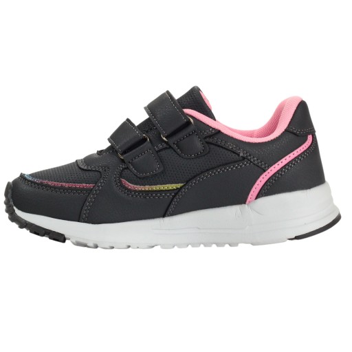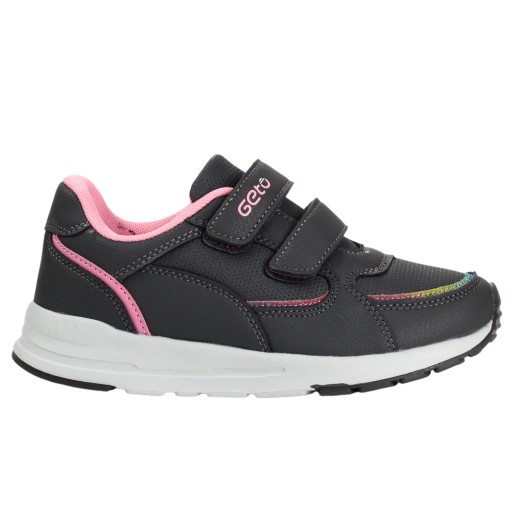 Спортивне взуття для дівчинки на липучці, сіре з рожевими елементами. Вони ідеально підходять як повсякденне, так і шкільне взуття - мають білу підошву з сірими елементами. Крім того, вони легкі, м'які і забезпечують зручність і комфорт використання. Шкіряна вставка. Застібка на липучці полегшує взування.