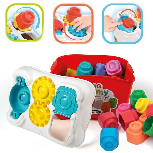 Відро має різнокольорові зубчасті колеса, які можна приводити в рух, розвиваючи спритність рук і спритність.