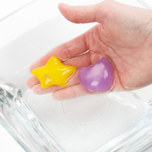 - Просто наповніть формочки кольоровим гелем, додайте блискіток, а потім занурте їх у воду з активатором.