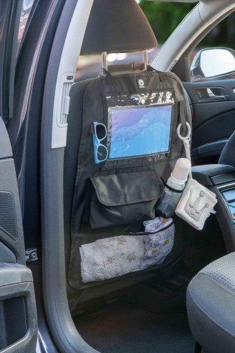 Органайзер універсальний, тому його можна швидко і легко прикріпити до будь-якого водійського або пасажирського сидіння. Він має багато зручних сітчастих відділень, закриті кишені та кишеню з фольги для планшета в комплекті, в ньому можна зберігати багато речей. Тут достатньо місця для книг, іграшок, улюбленої м’якої іграшки вашого малюка, закусок для подорожей, сонцезахисних окулярів, навушників, чашок і серветок. Це чудове рішення для батьків і дітей, тому що всі предмети знаходяться під рукою! Всередині є зручні петлі для підвішування речей, а на рівні очей дитини є кишеня з прозорою оглядовою панеллю для захисту планшета! Завдяки цьому ваша дитина може спокійно дивитися фільм або грати в гру на задньому сидінні. Органайзер Dooky виготовлений з міцного високоякісного матеріалу і легко чиститься. Крім того, завдяки його використанню ми можемо бути впевнені, що спинка не забрудниться та не пошкодиться взуттям дитини.