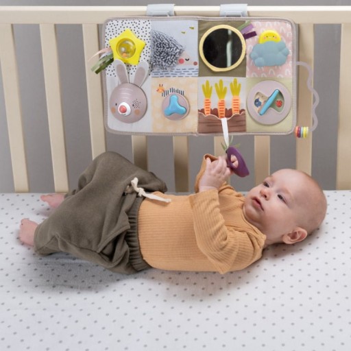 - Етап 1 (0 м+): Лежачи на спині - панель підвішена збоку на повідку. Лежачи на спині чи животі, дитина може відкривати для себе різноманітні функції та ігрові можливості.