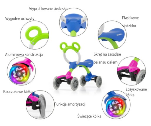 Orion Flash - це нова версія велосипеда Orion, який ми додатково оснастили колесами, що світяться.Як і його попередник, він має функцію амортизації, що означає, що дитина вчиться психомоторній координації, балансуючи тілом. Тож велосипед не лише розважає, а й навчає. Ще однією унікальною особливістю є гумові колеса з кульковими підшипниками, які забезпечують хороше кочення та те, що на ньому можна їздити як у приміщенні, так і на вулиці. Це не просто іграшка, як більшість катанок, а інноваційний пристрій, з яким нудьгуватиме жоден малюк або батько.