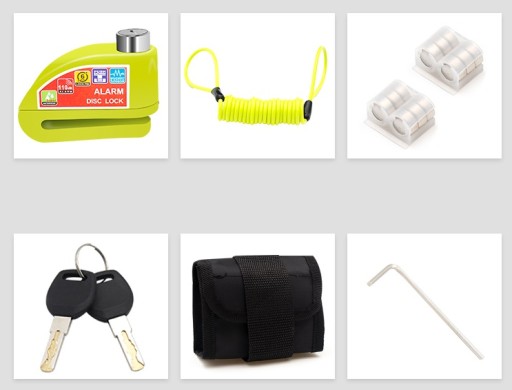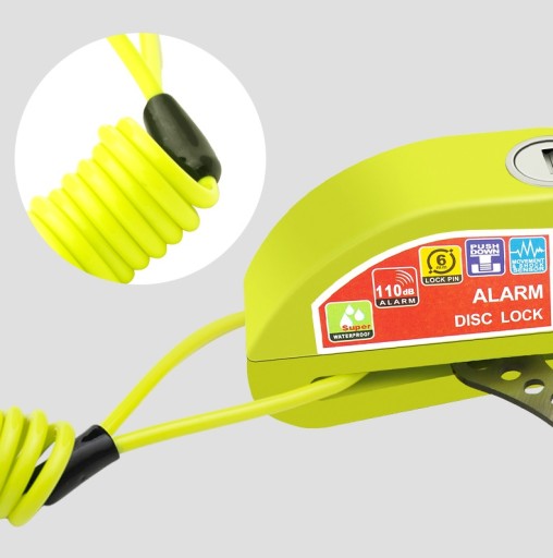 З чутливою вбудованою дуже гучною сигналізацією 120 дБ. При використанні замка можна вимкнути сигнальну сирену і використовувати захист як звичайний замок. Модуль сигналізації стійкий до погодних умов. У комплект входить літій-іонний акумулятор, що забезпечує тривалу роботу, і набір з 2 ключів. Фіксуючий штифт має діаметр 6 мм.