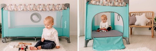 Міцна основа манежу дозволяє вільно грати всередині манежу до досягнення дитиною ваги 15 кг. Два колеса з можливістю фіксації дозволяють легко переміщати кошик без необхідності складати його.