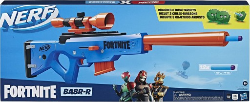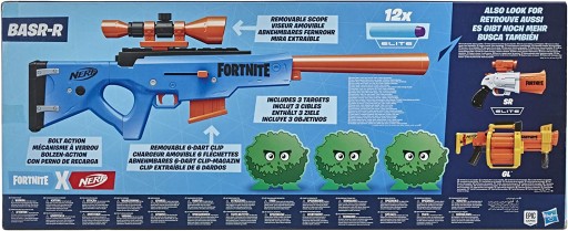 Снайперська гвинтівка Blue Nerf Fortnite BASR — це ручна снайперська пускова установка від Fortnite. Nerf був оснащений стилізованим прицілом і магазином на 6 дротиків. Зверху пускової установки є тактична планка і камера для очищення застряглих дротиків. Пускова установка має режим безперервного вогню, тому ви можете вражати цілі одну за одною!