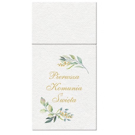 Столові серветки з набивними зеленими листочками і золотим написом «Перше Святе Причастя» ідеально підкреслюють характер церемонії.