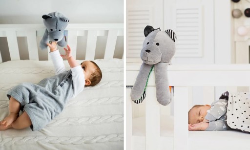 - У ведмедика шелестять вушка і відростки. Ніжки мають надійно вшиті магніти, які дозволяють кріпити ведмедика, наприклад, до поручня, ручки коляски або сидіння автомобіля.