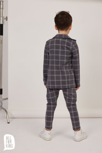 Куртка для хлопчика в клітинку. Виконано в графітовому кольорі. Застібається на одну кнопку. Спереду імітація кишень. Зручний крій і матеріал, в якому кожен хлопчик почуватиметься комфортно.