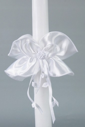 У подарунок причасна свічка для хлопчика чи дівчинки білого кольору. Головний убір виготовлений з білого блискучого атласу, оброблений бантом зі стрічки, посередині прикрашений білими трояндочками.Універсальний розмір підійде на будь-яку свічку. Прикраса призначена для прикраси обряду причастя або хрещення. Прикраса ідеально підходить для Першого Святого Причастя, вона тонка та делікатна.