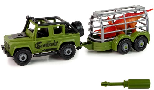 Зелений позашляховик легко перевезе велику рептилію, врятувавши її від утисків. В транспортному засобі є гвинти, які кріплять окремі елементи транспортного засобу.В комплект входить викрутка, з її допомогою можна повертати і відкручувати автомобіль. Закручуючи гвинти, малюк тренує руки, завдяки чому це підготує його до навчання письма в майбутньому та розвиває функцію руки.