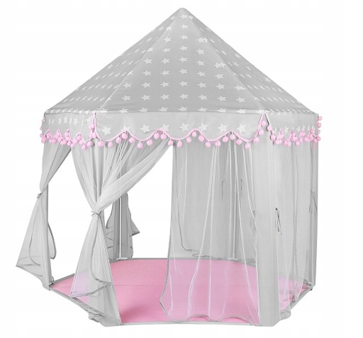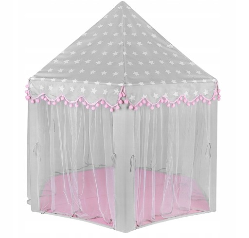 - НОВА ПОКРАЩЕНА МОДЕЛЬ Ми створили абсолютно нову вдосконалену модель намету. Ми використали поєднання рожевого та сірого кольорів із мотивом зірок. Крім того, на воланах є красиві помпони, які роблять його ще більш привабливим. Намет має 6 вхідних отворів і конічний дах. Все це виглядає фантастично і ідеально впишеться в будь-яку кімнату.