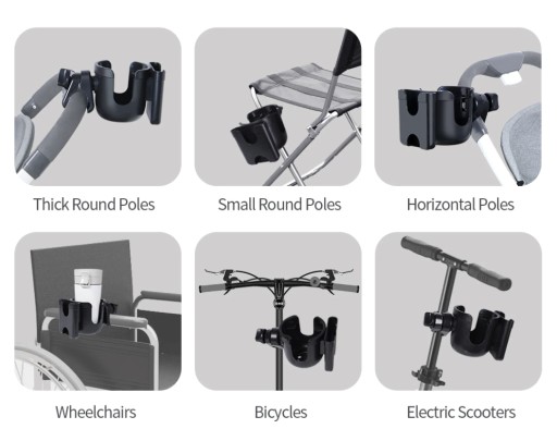 Крім встановлення тримача на коляску, ви також можете розмістити його на рамі велосипеда, інвалідного візка, ходунків або самоката - де вам це потрібно!
