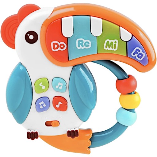 Барвиста пташка має музичні клавіші DO, RE, MI, FA, що світяться, 4 функціональні кнопки з мелодіями та звуками пташок і кольорові намистини для ковзання. Був також регулятор гучності звуку, щоб регулювати його інтенсивність відповідно до власних уподобань.
