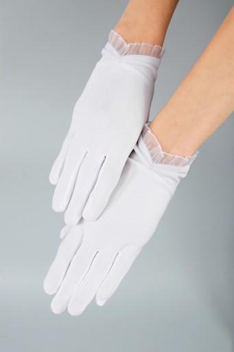 Рукавички для причастя на п'ять пальців з еластичного атласу. Прикрашена ніжним воланом і блискучою бусинкою. Завдяки своєму елегантному зовнішньому вигляду стане прикрасою будь-якої сукні чи альбому.