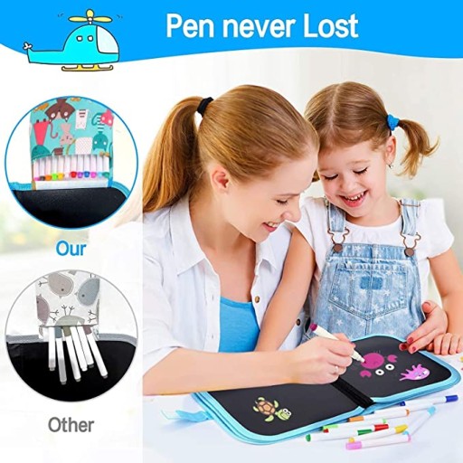 Портативна дошка для розмальовок: переносна дитяча дошка для розмальовок, яку можна мити, виготовлена з високоякісного нетоксичного ПВХ матеріалу. Книжка-розмальовка для дітей, яку можна прати, містить 14 сторінок чорного полотна та 12 кольорових фломастерів. Візьміть мистецтво з собою, дайте своїм дітям більше фантазії та насолоджуйтеся графіті, розмальовками та письмовими вправами.
