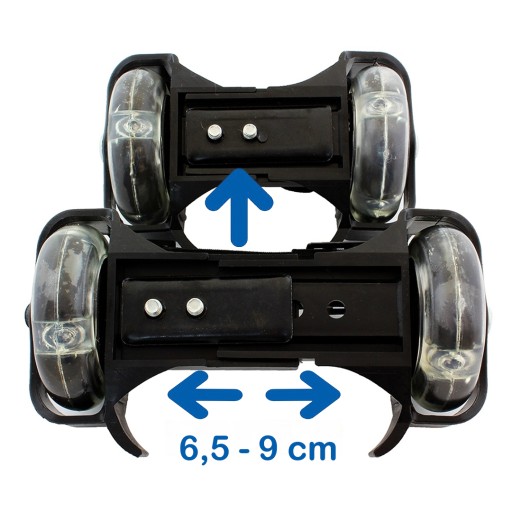 Просто відрегулюйте ковзани по ширині та прикріпіть їх за допомогою гумки зі спеціальною пряжкою! Бутони починають ефектно сяяти, як тільки ви їх розкручуєте. Додаткові джерела живлення не потрібні!