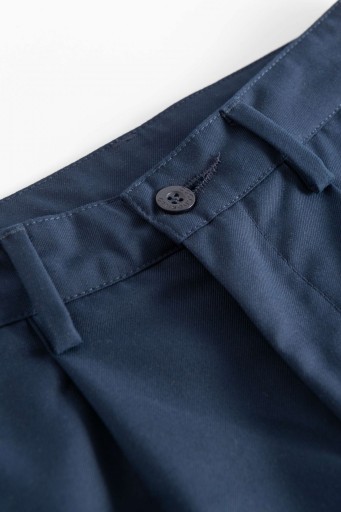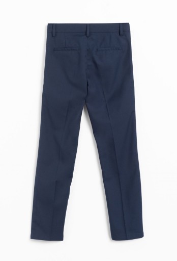 Штани прямі з випрасуваною складкою. Вони мають складки спереду. З боків кишені, ззаду фальшиві кишені. Застібається на блискавку і кнопку.