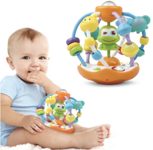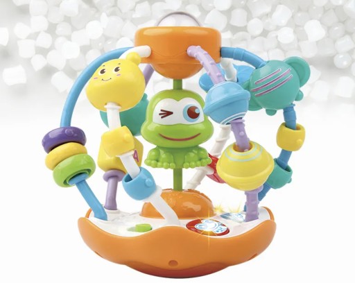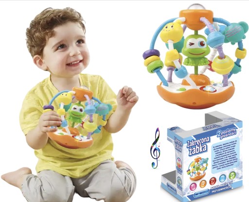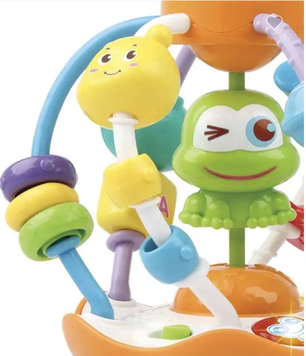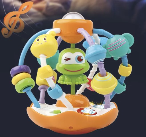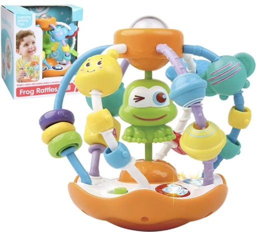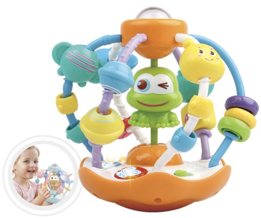 Мила жабка радісно кліпає очима, красива кулька з намистинками, які обертаються, крихітне безпечне дзеркальце боязко спокушає, а веселі звуки тварин, мелодії, кольори та вогники!