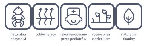 - під час носіння ідеально підтримує спину дитини, надаючи їй форму літери С (природний вигин хребта новонародженого), а правильна підгинання тазу дозволяє розташувати тазостегнові суглоби в положенні, яке підтримує їх правильний розвиток ( ноги повинні бути поставлені на ширині приблизно 60°-90° по відношенню до осі тіла, а коліна трохи вище низу (так звана буква «М»)