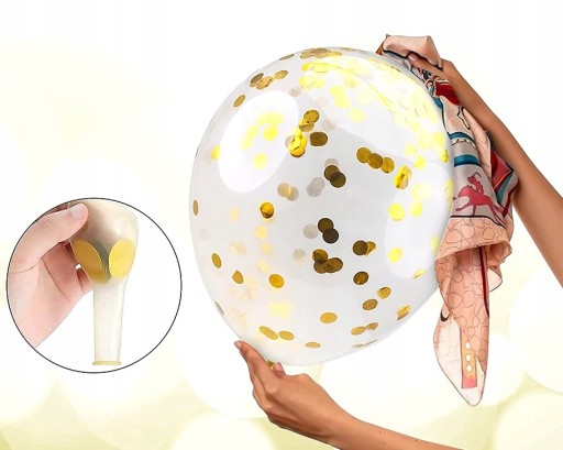 • Він складається з трьох різних видів повітряних куль (блискучих і прозорих, наповнених конфетті).