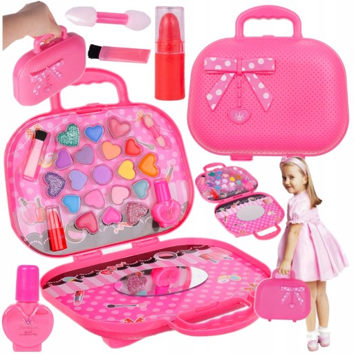 Розваги маленьких дівчаток у створенні макіяжу та прикрашанні нігтів позитивно впливають на розвиток їхньої уяви, творчих здібностей та формують почуття краси та естетики. Цей чудовий набір містить багато додаткових речей, як-от тіні для повік, помади та лаки для нігтів, у красивій рожевій сумці. Поліпшити макіяж? Потрібно застосувати новий? Без проблем! Завдяки тому, що вся косметика в наборі легко змивається і безпечна для шкіри малюка, вашій маленькій принцесі не доведеться ні про що турбуватися, коли щось піде не так. Все, що вам потрібно, це трохи теплої води, мило, і ви можете наносити новий макіяж за мить! Величезним веселощам не буде кінця!