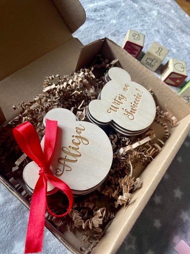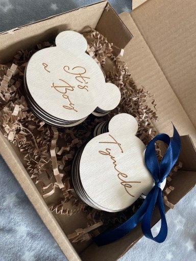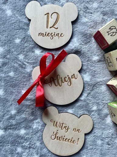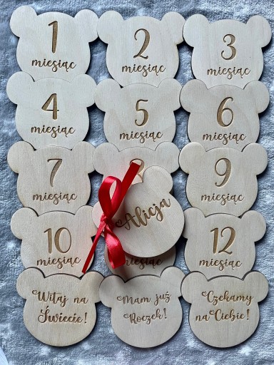 Ведмедики Дерев'яні таблички для фотографій малюка - 1 РІК ЖИТТЯ - 16 шт + бантик + декоративна коробка